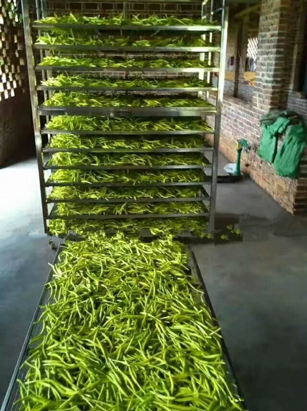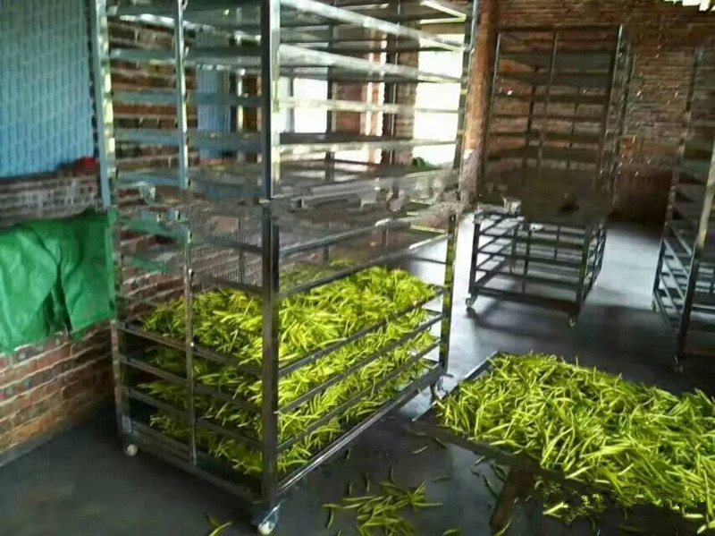 烘干工藝第三步:將高溫蒸煮后的黃花菜均勻鋪放到物料車內(nèi),注意厚度均勻,每層不超過(guò)3CM。